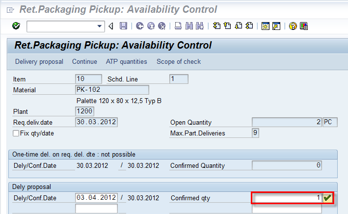 When creating returnable packaging pick up, system will automatically check how many stock of pallet exist in Cust.Ret.Pkg. You can only confirmed quantity based on your customer returnable packaging stock your customer have.