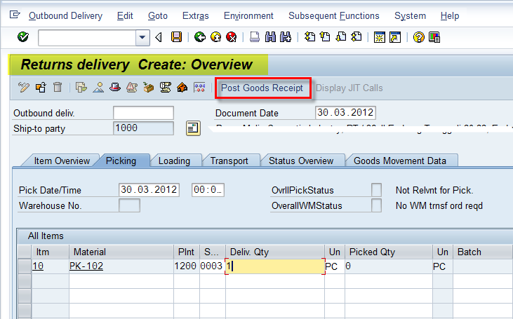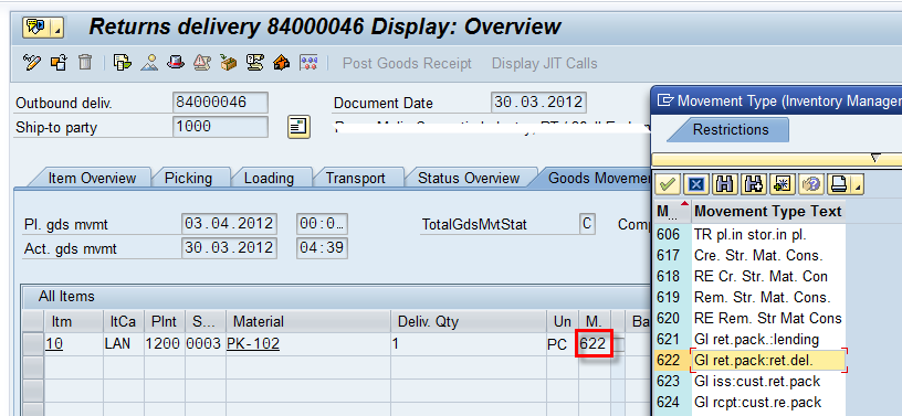 - Create a returns delivery for the sales order when the materials reach your company. The system proposes delivery type LR automatically. The transaction is completed by the goods issue posting which initiates a transfer posting from the customer’s special stock to your plant stock.
