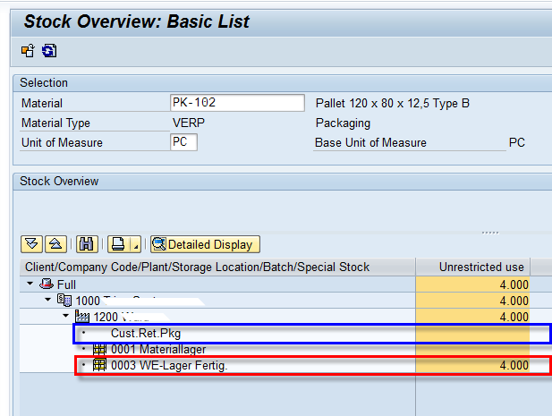 Check MMBE transaction. As you can see, your Unrestricted use stock of your pallet is back to four, and stock of Cust.Ret.Pkg become zero.