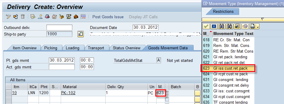 - Enter the required data on the customer, the returnable packaging, and the plant from which the materials are to be taken.