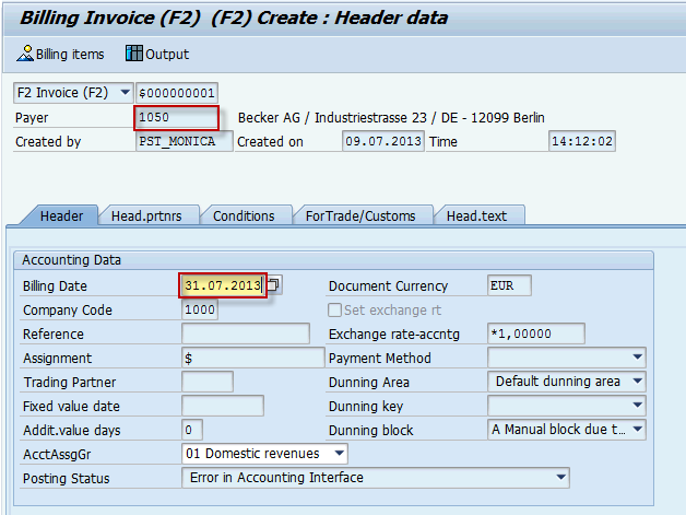 The system is automatically set the billing date as 31.07.2013. Although the value of billing date is set automatic, but you still be able to change it manually.