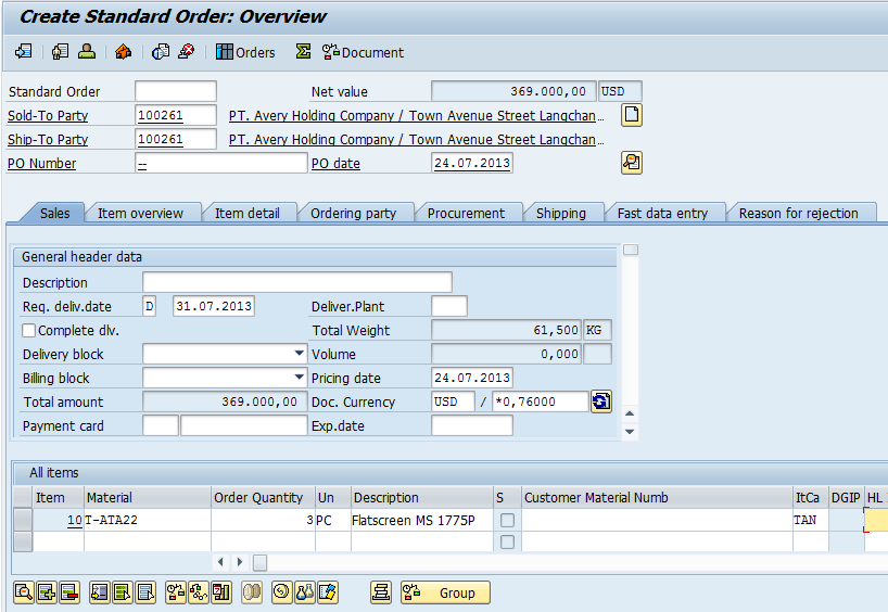 A customer order 3 materials to you each $ 123,000.00. Since the price of the product is high, thus your customer should paid some amount of debt as down payment. Let say that customer deal to pay $ 50,000.00 as down payment. Thus, you record the customer down payment as condition in sales order item. Then the process is continued to delivery and billing. Since delivery is made partially, thus the down payment amount that affect in billing document is divided proportionally based on quantity in delivery order.