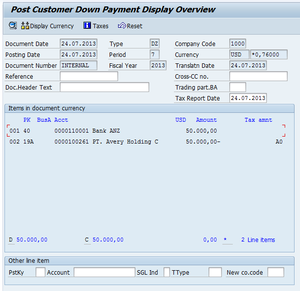The amount that deal with customer is $ 50,000.00. The payment of this customer down payment is record in FI transaction through transaction F-29. Ask your FI consultant how to input transaction down payment using this t-code.