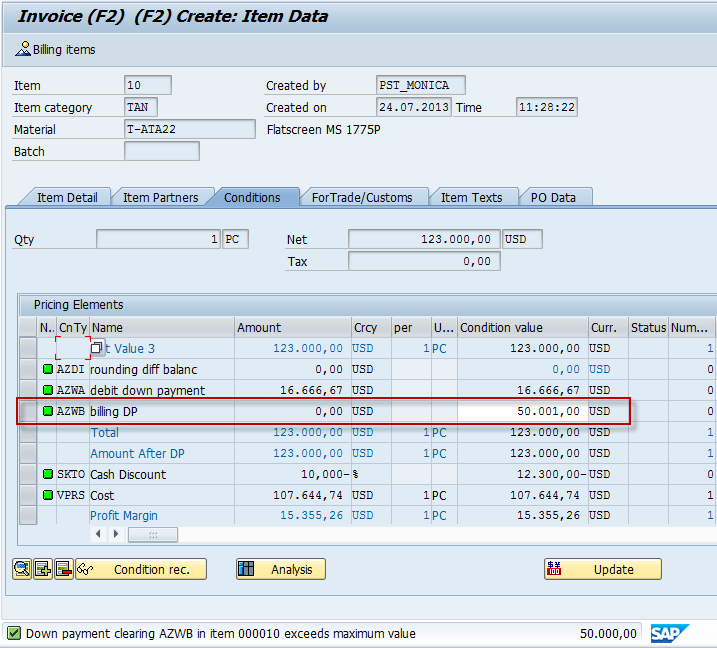 Change your sales order to enter the customer down payment in condition type AZWA for sales order item 10. Enter $ 50,000.00 as this amount is deal with customer for the payment through down payment.