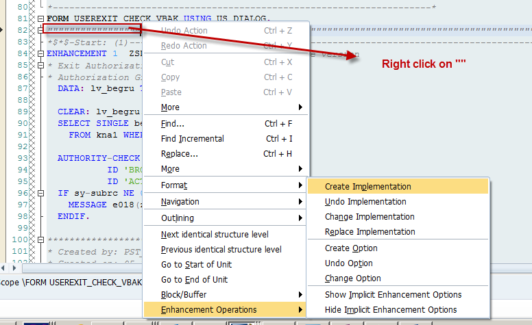 Right click on ” ” the choose Create Implementation. If there is sign ” ” appear, right click anywhere in section FORM USEREXIT_CHECK_VBAK then choose Show Implicit Enhancement Options.