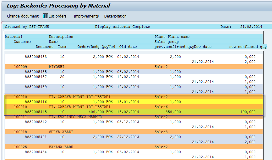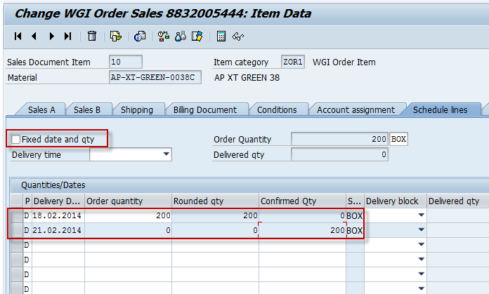 Since there is different date that is used to be able to confirmed this order, then the system propose new schedule line item below the first schedule line on 20.02.2014 with 196 BOX as confirmed quantity.